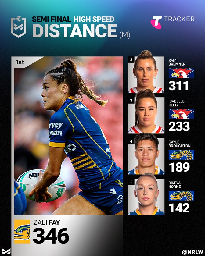 In both of those categories she ranked second behind Roosters fullback Samantha Bremner – who was the round’s other individual standout – leading the way with 7,588 metres in total distance and 768 of high speed running.