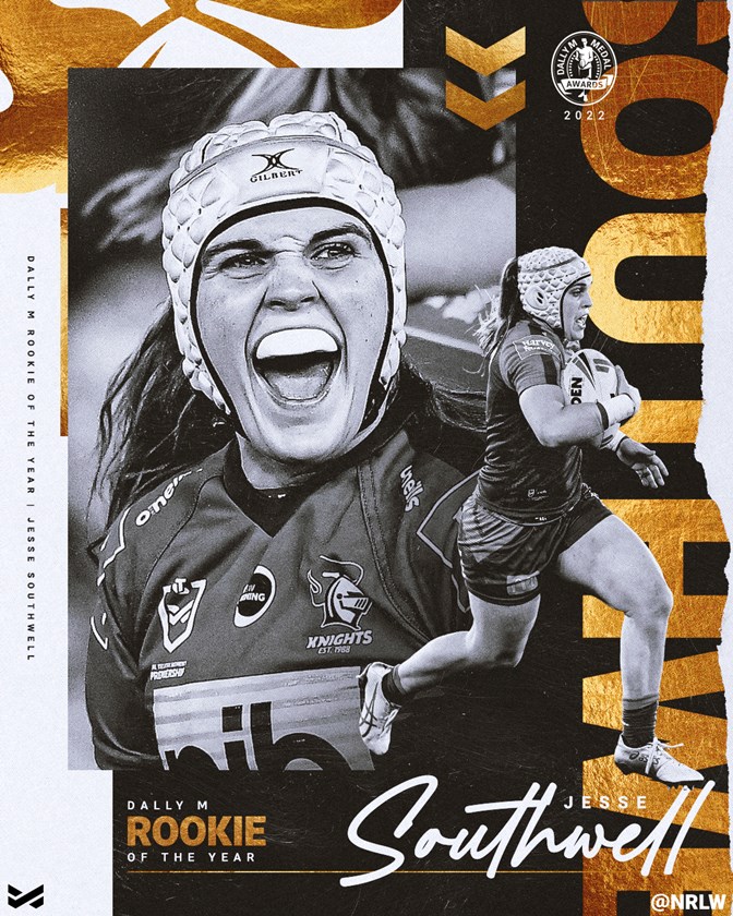 Newcastle halfback Jesse Southwell has claimed the Dally M NRLW Rookie of the Year Award for 2022 after a superb first season in the top grade for the Knights.