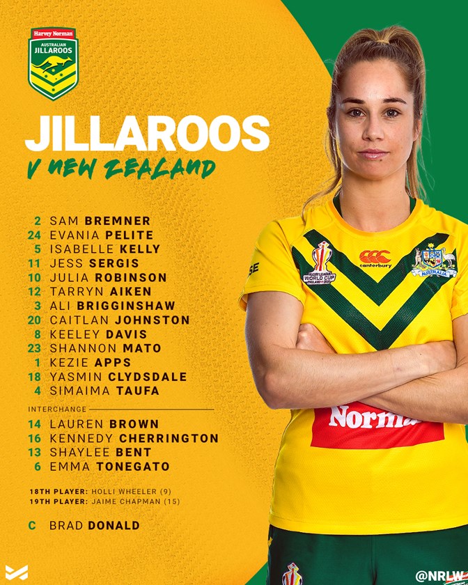 Harvey Norman Australian Jillaroos Coach Brad Donald has named his side for the Rugby League World Cup final against the New Zealand Kiwi Ferns on Sunday (AEDT) at Old Trafford.