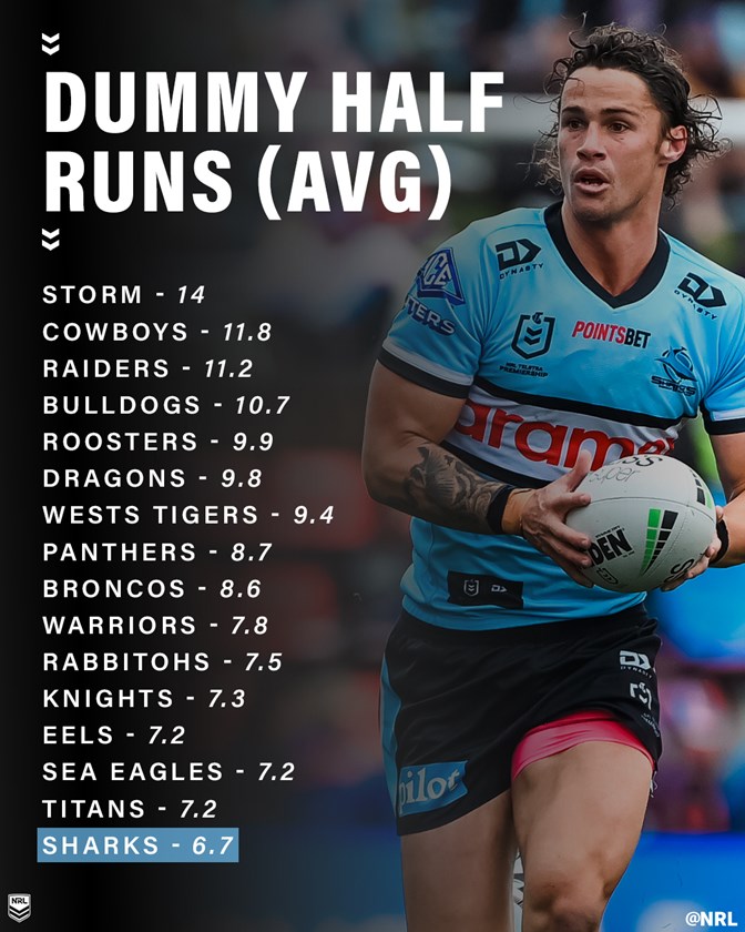 Depending on what sort of style you want to adopt then having the lowest number of dummy-half runs (119) may not be seen as an issue. It's clear the Sharks' No.9s were keen to move the ball on to irrepressible duo Nicho Hynes and Matt Moylan to let them do their thing so scooting out of dummy half wasn't always the option. To add some variety to their attack then a few more darts from Blayke Brailey could be the order of the day.