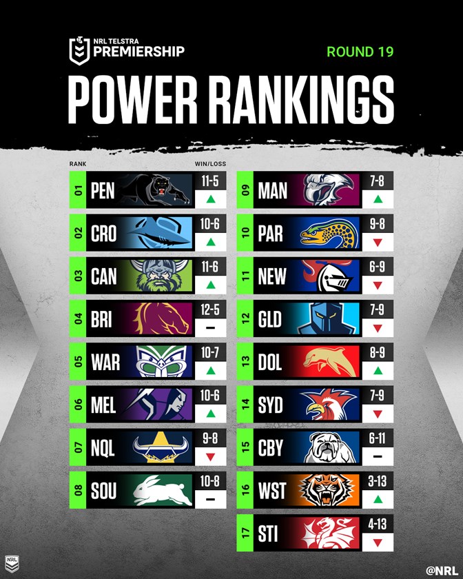 Thanks to a Round 19 bye, the Panthers are back on top of the NRL's Power Rankings, while important victories for the Sharks and Raiders have trailing closely behind.