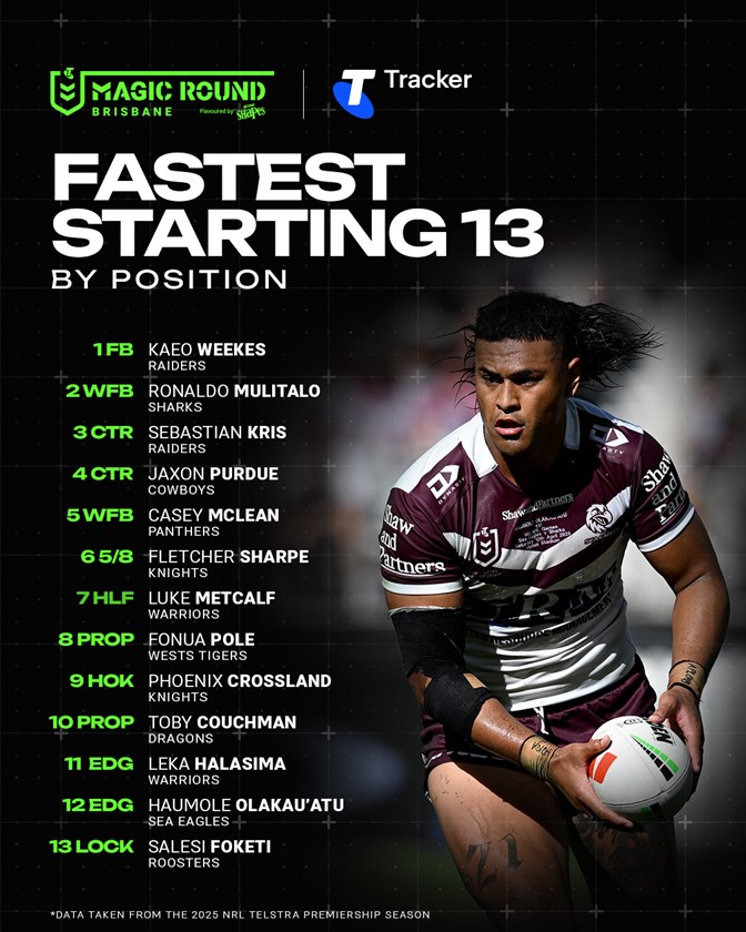Raiders fullback Kaeo Weekes has emerged as the fastest man in the NRL this year as the sport's speedsters prepare to put on a show throughout Magic Round.