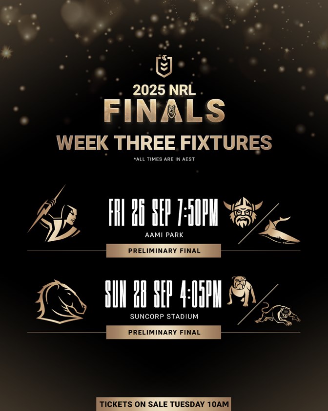 All matches in Finals Week Two will be broadcast live on the Nine Network, Fox League, Kayo Sports, 9NOW and Sky NZ.
