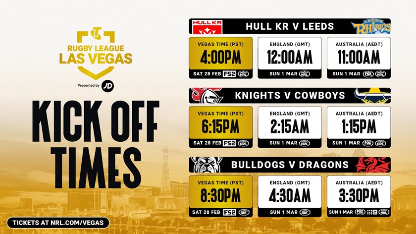 The Vegas triple-header will start with the heavyweight Super League clash between Hull KR and Leeds at 4.00pm (11am AEDT) followed by two highly anticipated NRL clashes between the Cowboys and Knights, and the Bulldogs and Dragons.