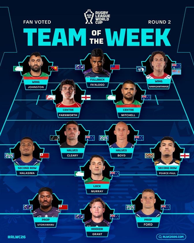 The RLWC2026 Team of the Week includes players representing six nations - Australia, England, Fiji, Papua New Guinea, Samoa and Tonga.