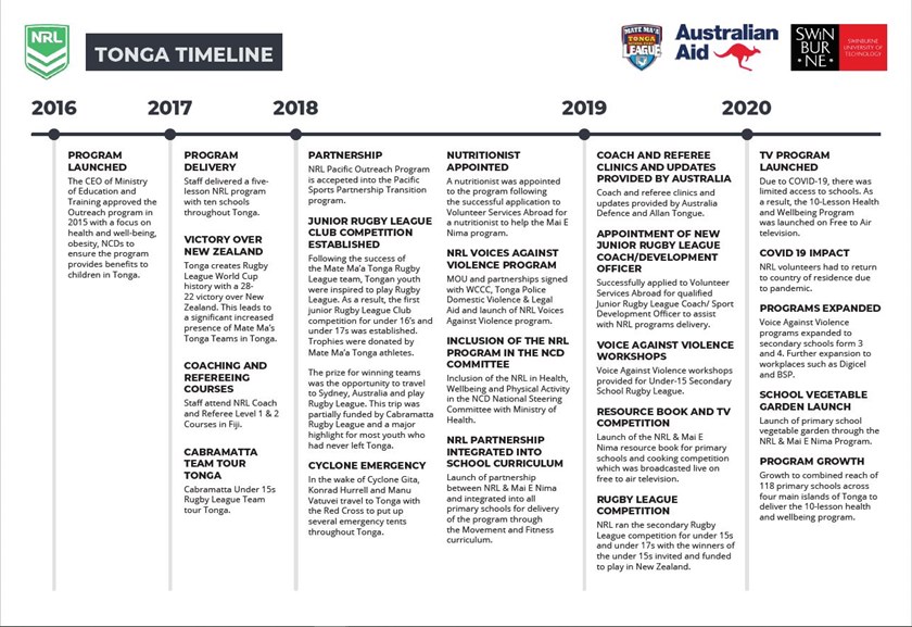 NRL in Tonga promotes living a healthy lifestyle through the Mai E 5 health & wellbeing program, advocates for the elimination of violence against women & children through the Voice Against Violence Program, and conducts rugby league development activities to promote pathways for players and officials throughout Tongatapu and the Outer Islands.