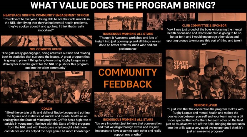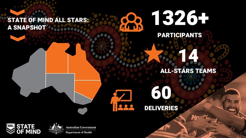 The Department of Health provided funding for the NRL to deliver a range of health promotion messages, workshops and education around Indigenous mental health through our NRL State of Mind program.