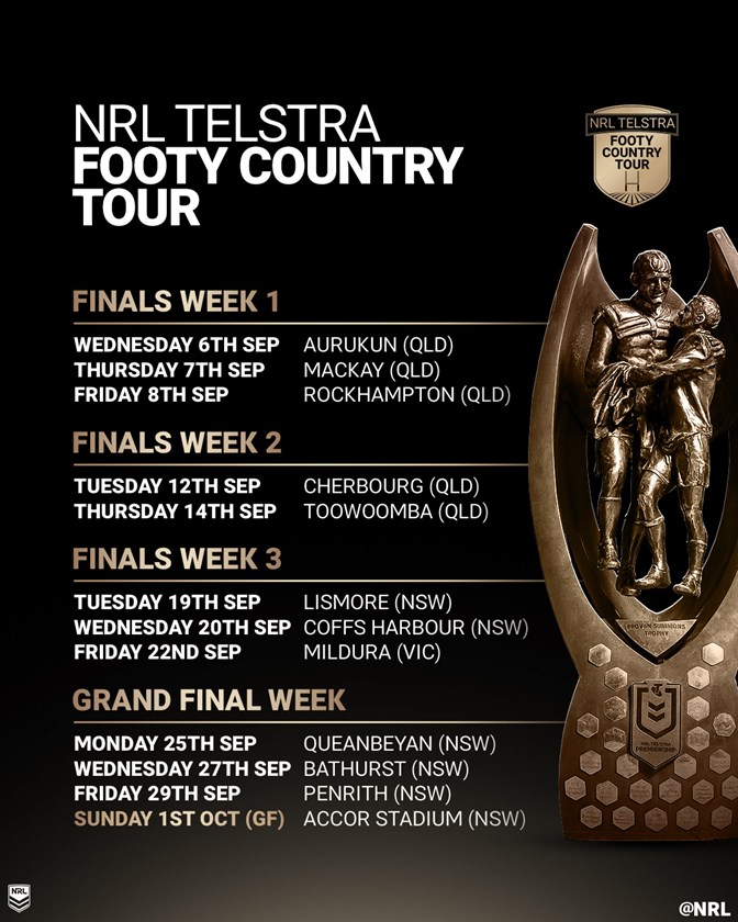 The Telstra Footy Country Tour has clocked over 9,500 kilometres as it ventured throughout footy country over 4 weeks taking the prestigious Proven-Summons trophy and the NRL Telstra Women's Premiership Trophy to Aurukun, Mackay, Rockhampton, Cherbourg, Toowoomba, Lismore, Coffs Harbour, Mildura, Queanbeyan, Bathurst, and Penrith.