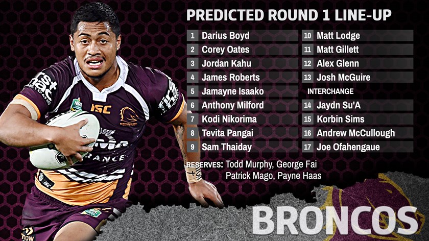 Jack Bird is likely to start off at centre once he is fit, but has been excluded from our predicted round one side as he returns from a shoulder injury. With Corey Oates also set to trial in the back row, we'd expect an up-and-comer like Jamayne Isaako to start on the wing and Tom Opacic to return at centre. Kodi Nikorima appears the front-runner to partner Anthony Milford at the scrumbase.