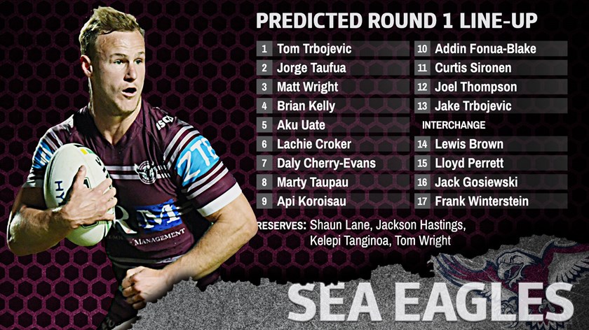 1 Tom Trbojevic, 2 Jorge Taufua, 3 Matt Wright, 4 Brian Kelly, 5 Aku Uate, 6 Lachie Croker, 7 Daly Cherry-Evans, 8 Marty Taupau, 9 Api Koroisau, 10 Addin Fonua-Blake, 11 Curtis Sironen, 12 Joel Thompson, 13 Jake Trbojevic. Interchange: 14 Lewis Brown, 15 Lloyd Perrett, 16 Jack Gosiewski, 17 Frank Winterstein. Reserves: 18 Shaun Lane, 19 Jackson Hastings, 20 Kelepi Tanginoa, 21 Tom Wright