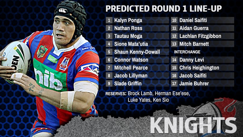 1 Kalyn Ponga, 2 Nathan Ross, 3 Tautau Moga, 4 Sione Mata'utia, 5 Shaun Kenny-Dowall, 6 Connor Watson, 7 Mitchell Pearce, 8 Jacob Lillyman, 9. Slade Griffin, 10 Daniel Saifiti, 11 Aidan Guerra, 12 Lachlan Fitzgibbon, 13 Mitch Barnett. Interchange: 14 Danny Levi, 15 Chris Heighington, 16 Jacob Saifiti, 17 Jamie Buhrer. Reserves: 18 Brock Lamb, 19 Herman Ese'ese, 20 Luke Yates, 21 Ken Sio.