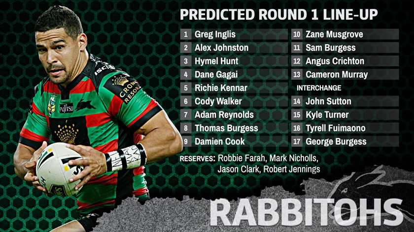 1 Greg Inglis, 2 Alex Johnston, 3 Hymel Hunt, 4 Dane Gagai, 5 Braidon Burns, 6 Cody Walker, 7 Adam Reynolds, 8 Thomas Burgess, 9 Damien Cook, 10 Zane Musgrove, 11 Sam Burgess, 12 Angus Crichton, 13 Cameron Murray. Interchange: 14 John Sutton, 15 Kyle Turner, 16 Tyrell Fuimaono, 17 George Burgess. Reserves: 18 Robbie Farah, 19 Mark Nicholls, 20 Jason Clark, 21 Robert Jennings.