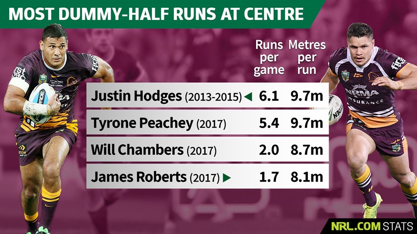 Roberts had the second most dummy half runs at Brisbane in 2017 after Andrew McCullough with 44 runs in 26 games at 1.7 per game and 8.1 metres per run.