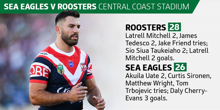 James Tedesco scored his first points in a Sydney Roosters jersey showing his usual touch of class with two second-half tries to help propel his side to a slim 28-26 lead over the Manly Sea Eagles at Central Coast Stadium.