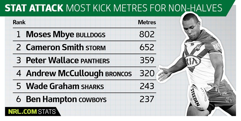 Canterbury's Moses Mbye may be making a splash since taking over as fullback but he hasn't relinquished his kicking responsibilities as the club, easily leading among non-halves players for total kick metres in the Telstra Premiership.