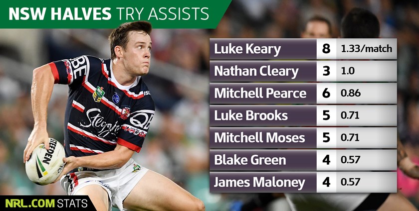 Roosters five-eighth Luke Keary (1.33) leads the NRL for the most try assists per match, while team-mate Blake Ferguson (196.1m) averages the most run metres per match on the wing ahead of Canterbury prop David Klemmer (169.87m) and James Tedesco (164.49m).