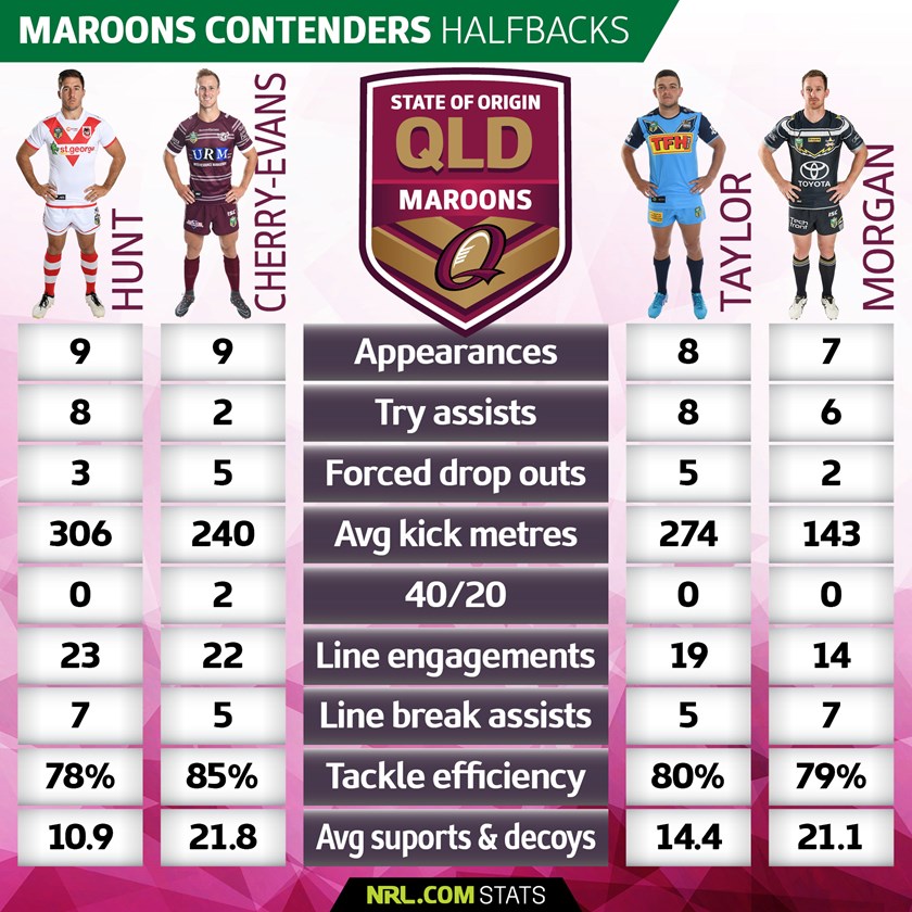 Hunt's blistering form at the table-topping Dragons should be enough to result in last year's game-three utility officially take over from Cronk and Thurston as the man to guide the Maroons around the park. His stats are solid in attack and defence with the equal-most try assists and line-break assists of any contender and he boasts an underrated running game and quality long kicking game.