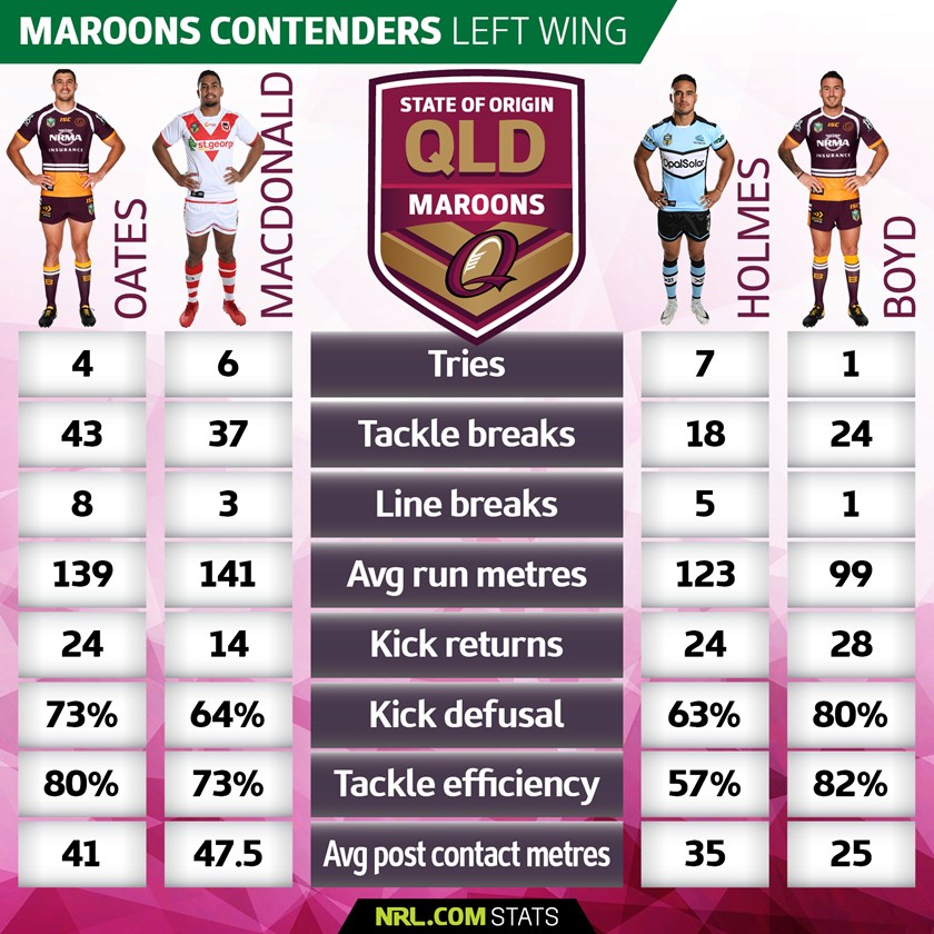 Possibly the most hotly contested spot in the Maroons side with a number of genuine standouts vying for one spot. With Greg Inglis set to return at left centre after missing last year injured, the temptation to rekindle his partnership with long-time left-edge partner Darius Boyd will be overwhelming. They are one and two on the all-time Origin try-scoring list and while Boyd hasn't been in peak form (in part due to ongoing hamstring niggles) he has never let down Queensland or Australia. Boyd's biggest weakness is taking the tough carries early in sets where the younger legs and bigger bodies of his rivals have a distinct advantage.