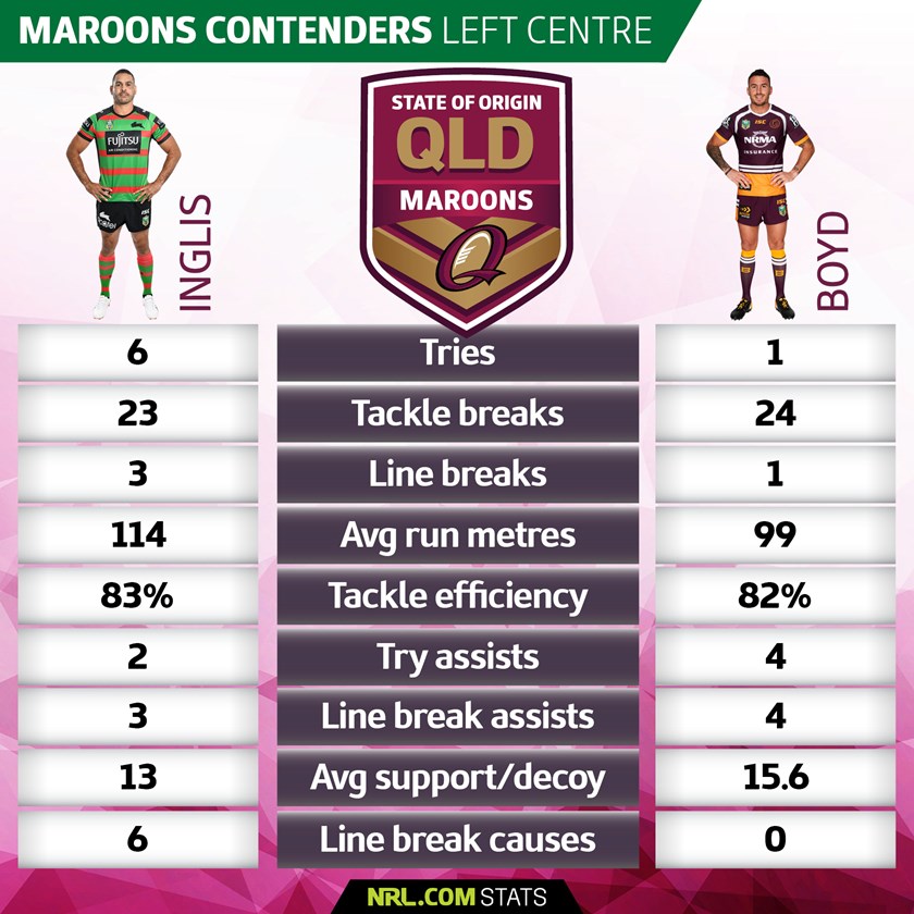 Boyd gets a second bite at the cherry here after playing well in his one game at centre for Queensland last year. Likely bench utility Michael Morgan is the other name in the mix if anything happens to Inglis before June 6, given the Maroons are short on genuine specialist centre options. The names on the next rung down include Ben Hampton, Dale Copley, Brenko Lee, Hymel Hunt, Brian Kelly, Tom Opacic and Javid Bowen.