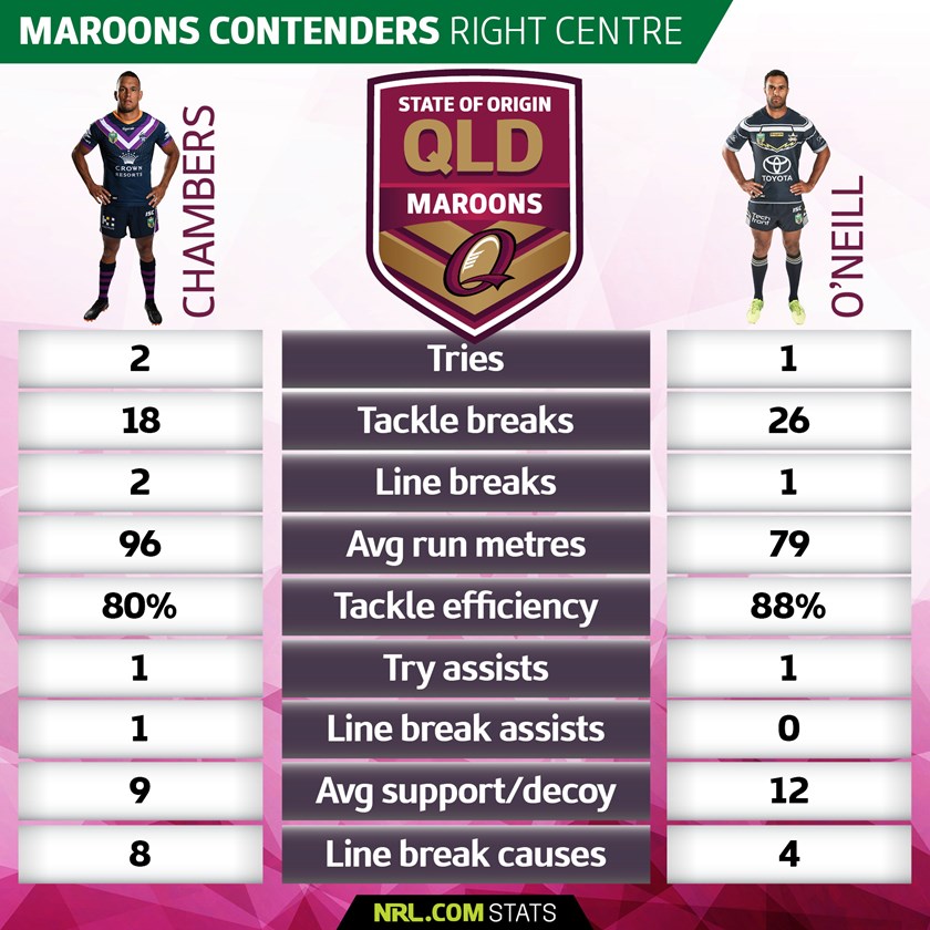Chambers is the surest of sure things at right centre. The Storm and Kangaroos centre's 18 busts and two tries in eight matches is a fairly light return for a player of his calibre but that won't concern the selectors in the slightest.