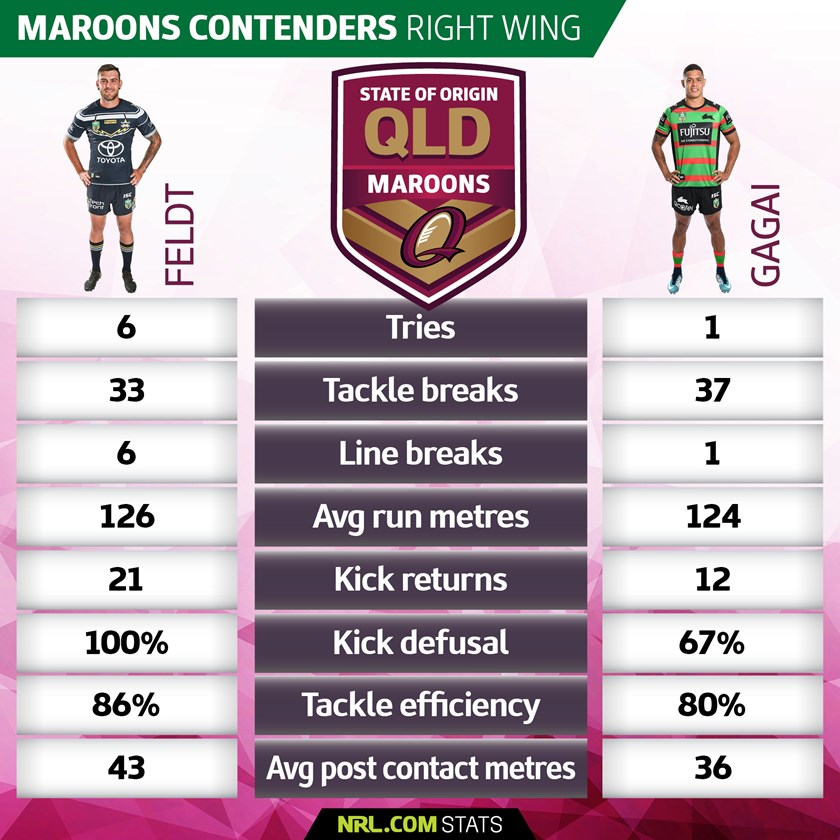 A man of the series award last year should surely be enough to see Gagai retained on the Maroons' right flank. Unforeseen injuries or suspensions could potentially mean he gets shuffled into the centres, otherwise he will line up in his familiar spot on the right flank. He has played most of this season at right centre for the Rabbitohs and while he has seemed quieter than last year with just the one try, his 37 busts in 10 games is third among regular centres.