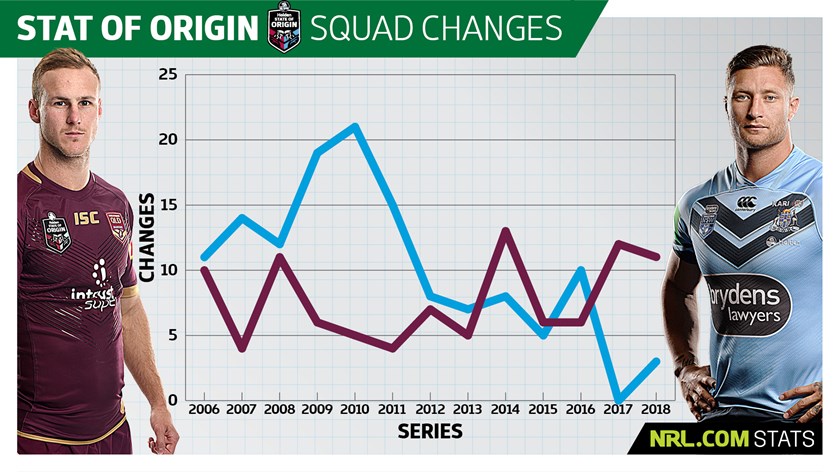 The figure has only been greater on one other occasion - in 2014 when the Maroons made 13 changes - again indicating the luxury Queensland have had in the past and their potential challenges they could face in the future with uncertainty around several positions.