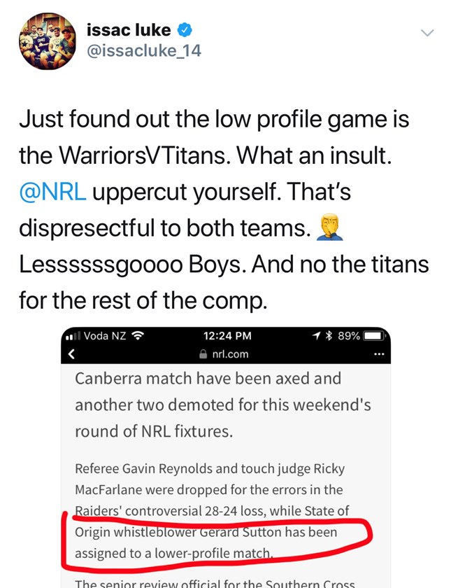 Warriors hooker Issac Luke did not appreciate his team's clash being described as a low-profile game, voicing his disappointment on Twitter, before deleting the tweet.
