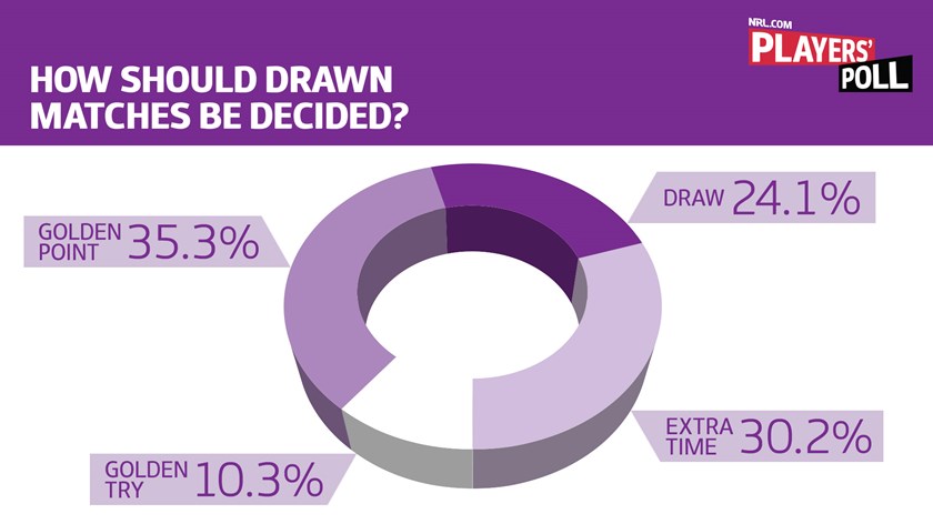 The verdict: Of the four options provided to the players polled, most voted to keep the current golden point system in place. You could look at it in a different way, with almost 65 per cent of players voting for a change in some capacity. The most supported form of change is to introduce a 10-minute extra-time period with the score after 90 minutes to decide the result. A quarter of the players polled believe the match should end in a draw after 80 minutes. Only 10 per cent of players support the idea of golden try.
