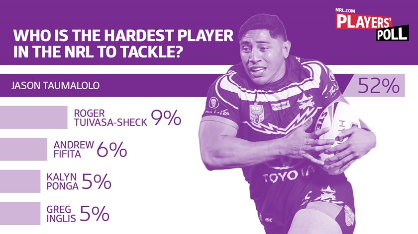 The verdict: The wrecking ball that is Jason Taumalolo has been voted the most difficult player to bring to a halt. It's not just strength that has been recognised, with the dazzling footwork of Roger Tuivasa-Sheck earning him second spot.