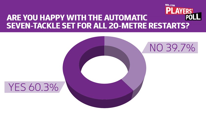 The verdict: While there has been plenty of commentary around the frustrations of having every 20-metre restart constitute a seven-tackle set for the attacking team, it appears the majority of players polled don't hold those same frustrations. More than 60 per cent of players have voted to keep the rules as is, despite claims a seven-tackle set is too harsh of a punishment for certain in-goal infringements.