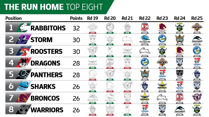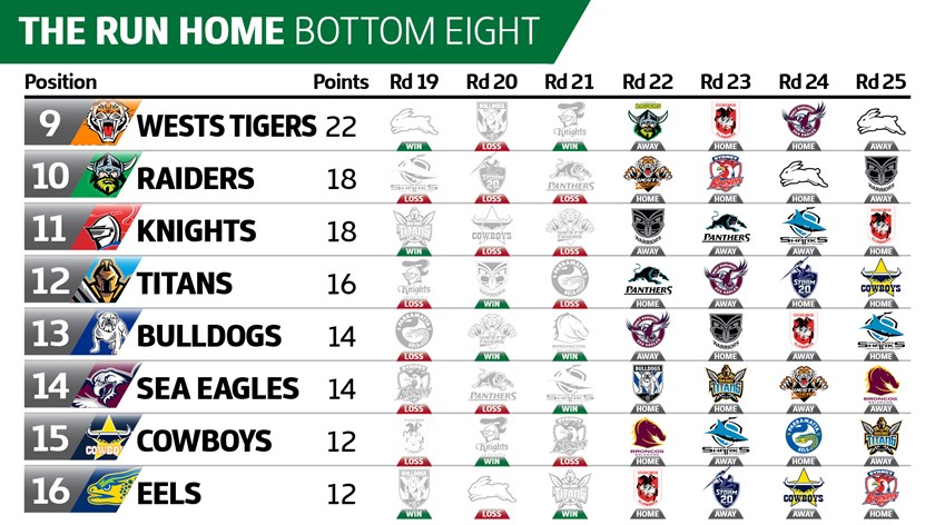 Meanwhile, the Panthers and Roosters both have tough runs home, each facing three away games. The Knights have the toughest schedule of all sides with three away games on the trot followed by a tough home clash with the Dragons, while Parramatta have the most difficult task out of sides in contention for the wooden spoon with matches against the Dragons, Storm and Roosters plus what looms as a crucial game against Johnathan Thurston's Cowboys in round 24.