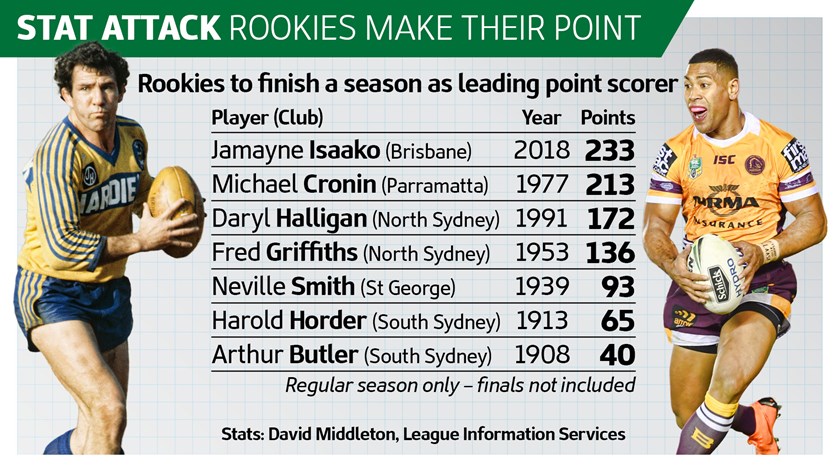 Isaako's tally of 233 points from the regular season, sure to grow from at least one finals match, has beaten Michael Cronin's 1977 effort of 225 points (including finals) in his first season at Parramatta that also landed him the Rothmans Medal and a grand final appearance.