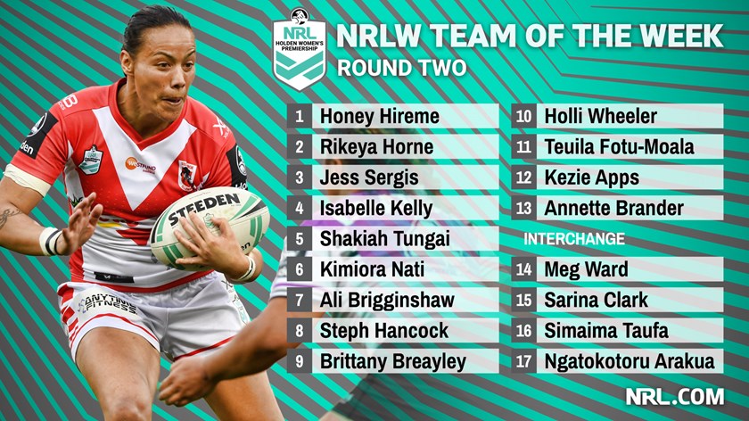 1. Honey Hireme (St George Illawarra Dragons) - A five-star performance from the Kiwi Ferns international. The Dragons found their perfect replacement for the injured Sam Bremner with Hireme given a licence to roam before churning out 170 metres from 10 carries along with four tackle busts. Could make it hard for coach Daniel Lacey to move her back to the centres.