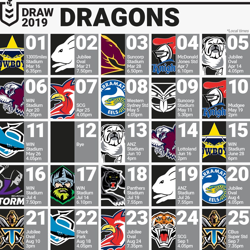 Here is all you need to know about the St George Illawarra Dragons' 2019 Telstra Premiership draw.