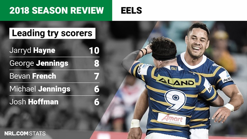 Despite missing a third of the season through injury, Jarryd Hayne's late-season form spike helped him to 10 tries for the season – the only Eels to hit double digits. Winger George Jennings (eight) had his best season after a few years wrecked by injury and Bevan French crossed seven times.