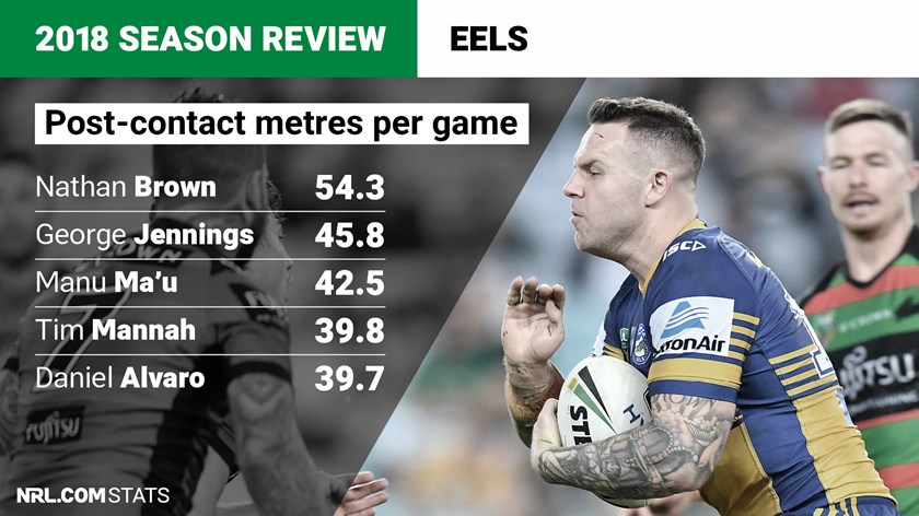 Hard-working lock Nathan Brown's 54.3 post-contact metres per game was a club high, but not quite enough to see him into the NRL top 10. Tim Mannah was the best on a per-carry basis with 3.77 post-contact metres per hit-up but that too falls outside the NRL top 10. Team-wise the Eels finished 12th for post-contact metres made with 481 per game and were fourth-worst in terms of conceding them at 510 per match.