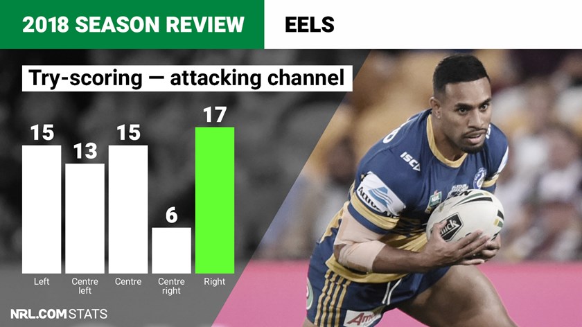The Eels' most profitable channel for generating tries was the centre-left area, with 29% of their season's 66 four-pointers originating there, leading to 28 of their 66 season tries scored on the left wing or left channel. Their biggest scoring channel was right wing, with 17, though just a further six were scored in the right centre channel. All up, 66 tries was the third-worst tally in 2018.