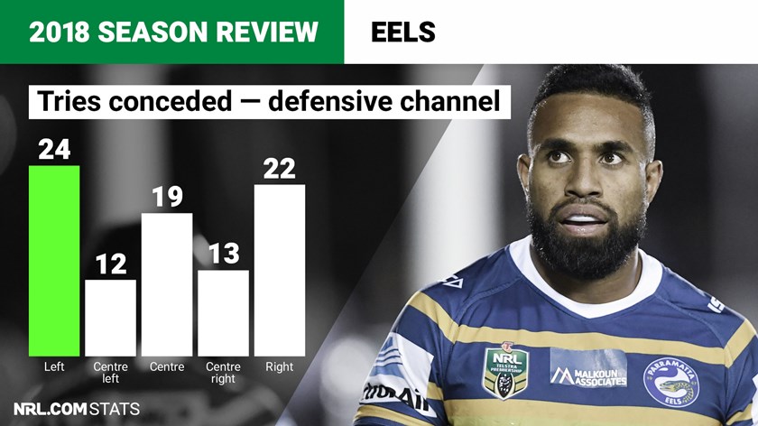 The same left channel that produced almost one third of the Eels' tries scored was also responsible for letting in the same proportion, with 29% of try-causes coming on the centre-left – well up on the NRL average of 22%. The other four channels (left flank, right flank, centre, and centre-right) were all consequently slightly down on NRL average.