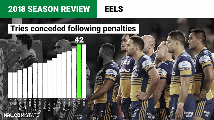 This was a real costly department for the Eels, who were level with the Titans when it comes to conceding the most tries from penalties. Both clubs let in 42 tries in the sets following a penalty conceded, even though the Eels were only the eighth-most penalised team with 200. Mitch Moses (20), Tim Mannah and Brad Takairangi (both 15) were the club's most penalised players.