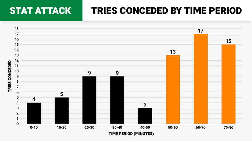 They struggled in the final 30 minutes though, conceding 45 tries, indicating fatigue became a factor, even though they were ranked as the best scrambling side.