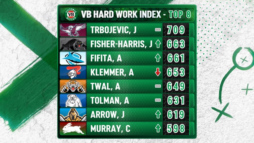 The heart and soul of Manly just keeps on delivering. Sea Eagles forward Jake Trbojevic has taken a significant and outright lead on 709 points - 46 clear of Fisher-Harris. Trbojevic is enjoying a slight career increase of 139 metres per game, while he's seemingly guaranteed for at least 40 tackles per game. Where some players struggle with negative play, defensively he's been sound with only seven missed tackles for the season. In his only downfall, he's lost points with eight penalties conceded in total.
