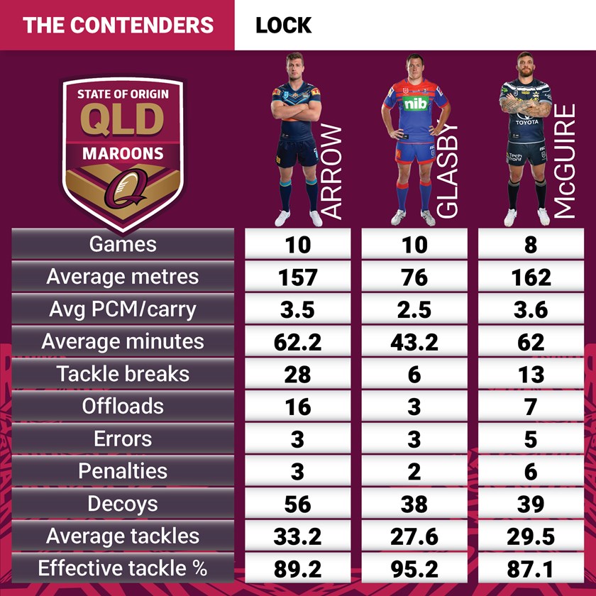 Realistically, any of these three could be used as a starting or bench prop; Arrow started at prop in game three last year and was among his side's best in the dead-rubber win, McGuire has started one of his 11 Origins at prop and Glasby played most of his club career at the Storm as a prop.