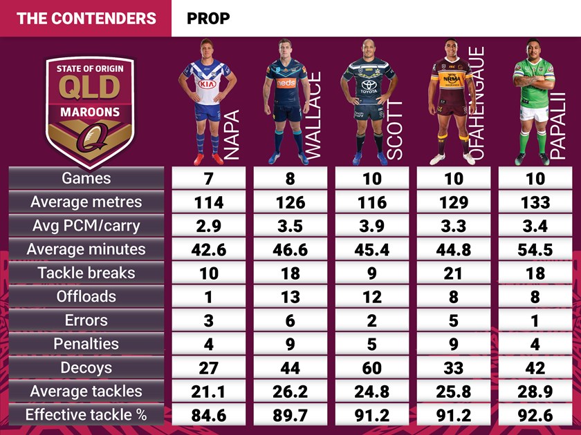 There is no getting around the fact that Napa's numbers are poor. The only regular starting props to have completed fewer tackles have played fewer games, and no regular starting prop in the NRL has a worse effective tackle percentage. His average metres are the lowest of all candidates and his post-contact metres per carry are among the lowest for regular props in 2019.