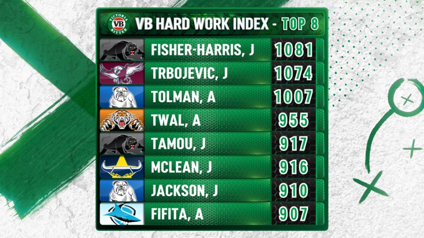 Kiwi international James Fisher-Harris is continuing his hard-working ways in 2019 to race to the top of the VB Hard Earned index leader board after 13 rounds. Fisher-Harris has had the luxury of an extra game under his belt in comparison with the likes of last month's top four Trbojevic, Fifita and Knights workhorse David Klemmer, who is out injured. The Panthers forward has been their most consistent player on the paddock to average 119 metres per game and be ranked third in overall tackles made with 567.