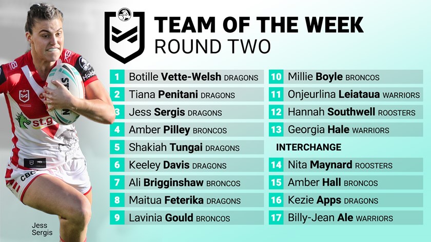 A dominant performance from the Dragons fullback for a second consecutive week with a NRLW record of 212 running metres. Scored a long-range try late in the game to cap off two line-break assists and four tackle busts in her efforts.