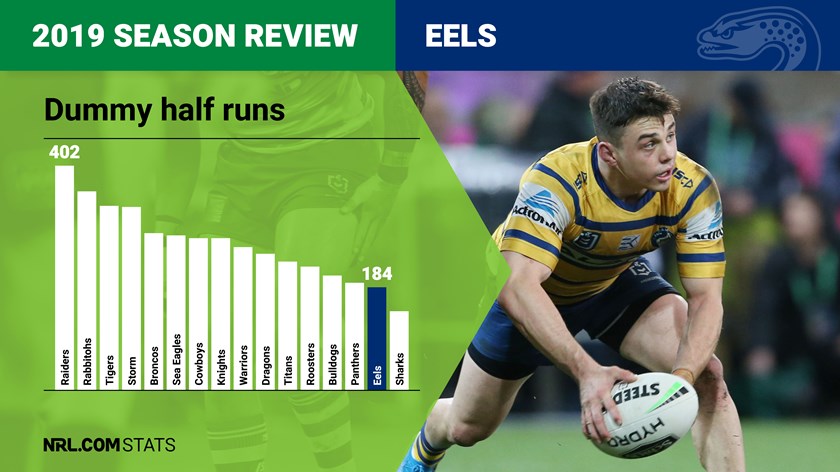 A feature of his game was a lack of hesitation from dummy-half whether passing, running or kicking. He was certainly selective when running, with the Eels registering the second-lowest dummy-half runs (7.7 per game) and third-lowest dummy-half run metres (71m per game).