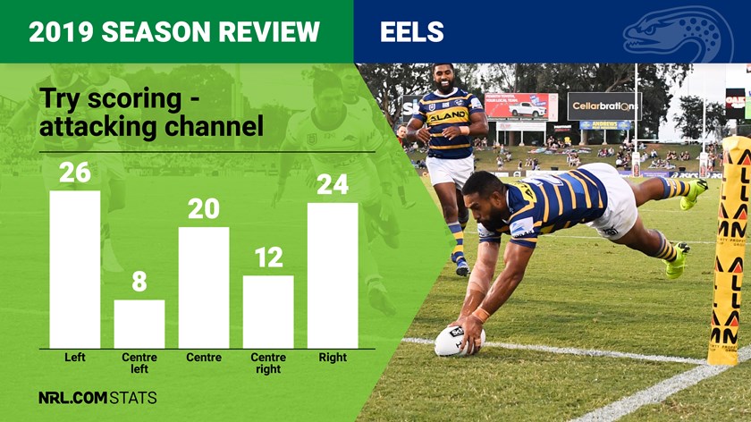 With left-side winger Maika Sivo nabbing 20 tries to top the season scorers' list it's no surprise the left flank was Parramatta's most profitable channel, with 26 of their 90 four-pointers.