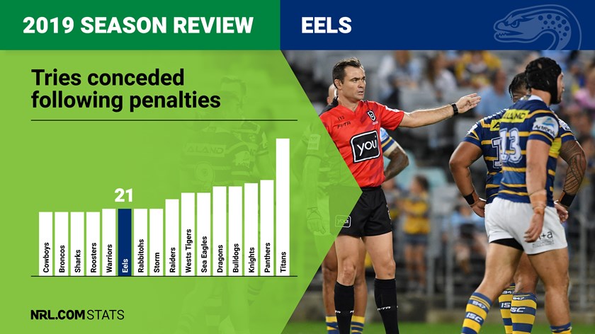 The ability to respond well to adversity was not a strength for the Eels in 2018 but they made strides in 2019, conceding just 21 tries in the set following a penalty – just one off a trio of league-leaders.