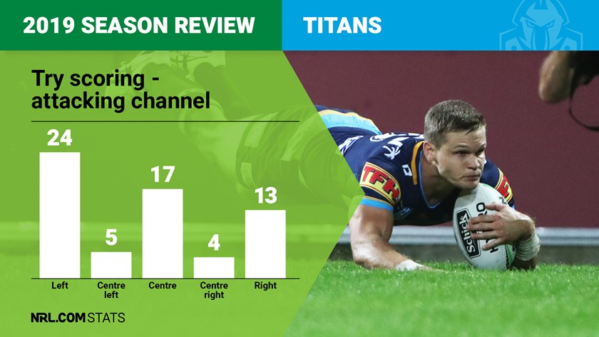 Only the Bulldogs scored fewer tries than the Titans in 2019 so scoring points overall was an issue but of their 63 four-pointers, 24 came on the left sideline as Phillip Sami and Dale Copley in particular got across the stripe semi-regularly.
