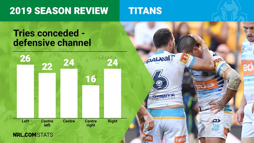 The Titans' 112 tries conceded was an NRL high with the Dragons (101) the only other club to concede triple digits through 2019. Worryingly they came right across the board so there's no one specific area that can be tidied up. The left (26), centre-left (22), centre (24) and far right (24) channels all conceded over 20 tries with only the centre-right channel (16) keeping things relatively quiet.